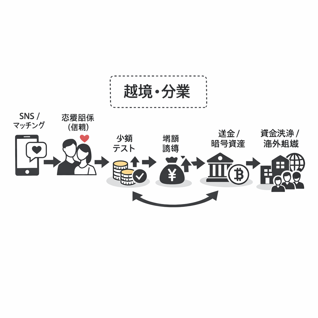 - 恋愛と金儲けの融合、2. 非対面・遠隔・越境の組織犯罪