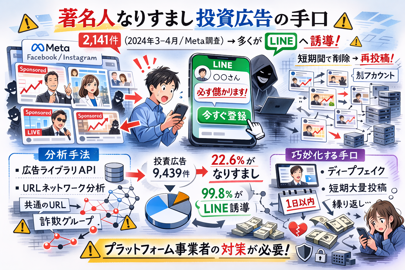 この論文は東京大学の澁谷 遊野先生と中里 朋楓先生の研究で、2024年3月から4月の1ヶ月間にMeta(Facebook/Instagram)上で掲載された広告を分析した結果、2,141件の著名人なりすまし広告が特定されました。そのほとんどがLINEという閉鎖的なチャット空間へユーザーを誘導しており、プラットフォーム側が削除を行っても、類似のコンテンツが別のアカウントから繰り返し投稿される実態が浮き彫りになりました。本研究は、広告がリンクしている外部URLのネットワークを分析することで、従来のルールベースでは検知できなかった詐欺広告を効率的に特定する手法も提案しています。巧妙化するデジタル空間の詐欺に対し、プラットフォーム事業者のデータ開示と、技術的介入の必要性を論じた重要な一石です。