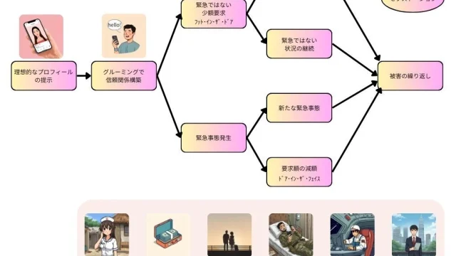 手口モデル 国際ロマンス詐欺の基本~説得の7段階モデル Monica Whitty先生のロマンス詐欺説得技法モデル。 オンライン恋愛詐欺の被害者20名インタビューから、詐欺師が信頼を仕込み送金へ導く「7段階モデル」を提案。認知的不協和やニアウィン現象で“やめにくさ”も解説。 2026.02.07 手口モデル犯罪学言語的・言説的戦略